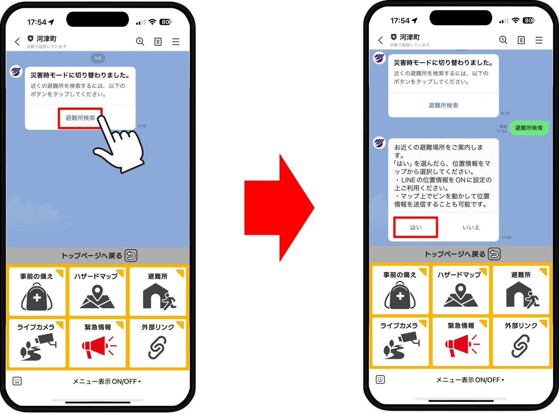 災害時の情報収集や避難所検索などの機能を提供します。災害の危険が迫っている場合などにリッチメニューが災害時モードに切り替わります。 「避難所検索機能」は災害時モードでないときでも、メニューの「防災情報」→「避難所」→「避難所検索」からいつでも起動することができます。 災害時に限らず、普段から近くの避難所の場所を知っておくことで、万が一災害が発生した際にも落ち着いて避難することができます。