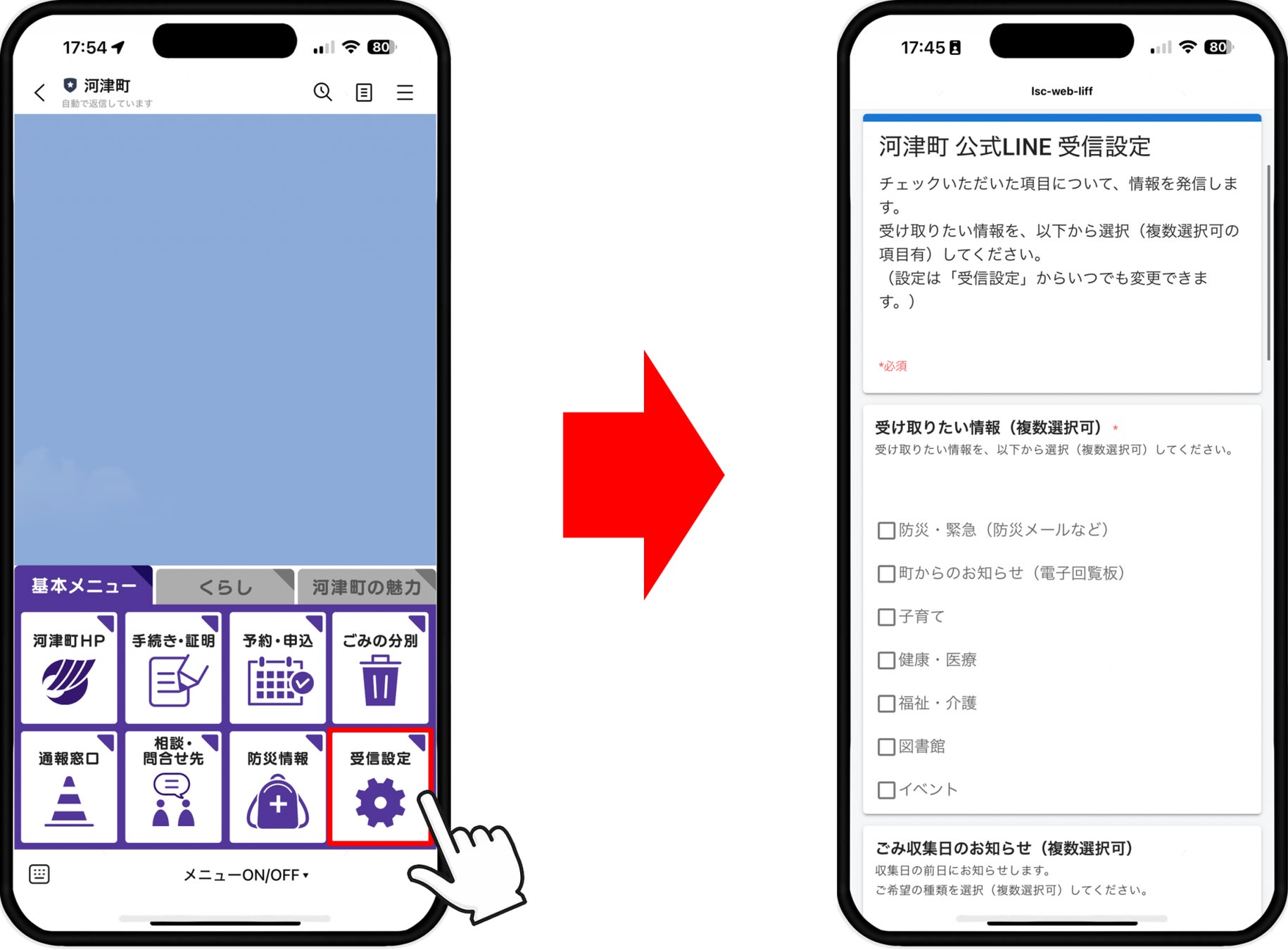友だち追加をしたユーザーは受信設定に回答することで、受け取る配信の情報カテゴリーをカスタマイズすることができます。あわせて「居住地区」「年代」「性別」に回答することで、属性情報にあわせた情報を効果的に受信することができ、重要な情報を逃しません。