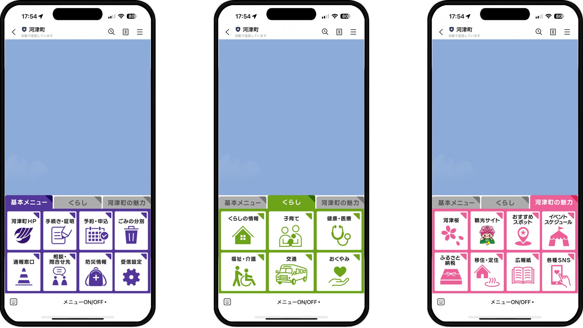 画面下部に固定されている「基本メニュー」「くらし」「河津町の魅力」の3つのリッチメニューからチャットボットを起動させ、各種情報が掲載されているWebサイトに遷移することができます。従来はホームページを検索し、該当ページにアクセスすることで得ることができた情報ですが、今後はLINEのトーク画面から手軽に情報源にたどり着くことができます。