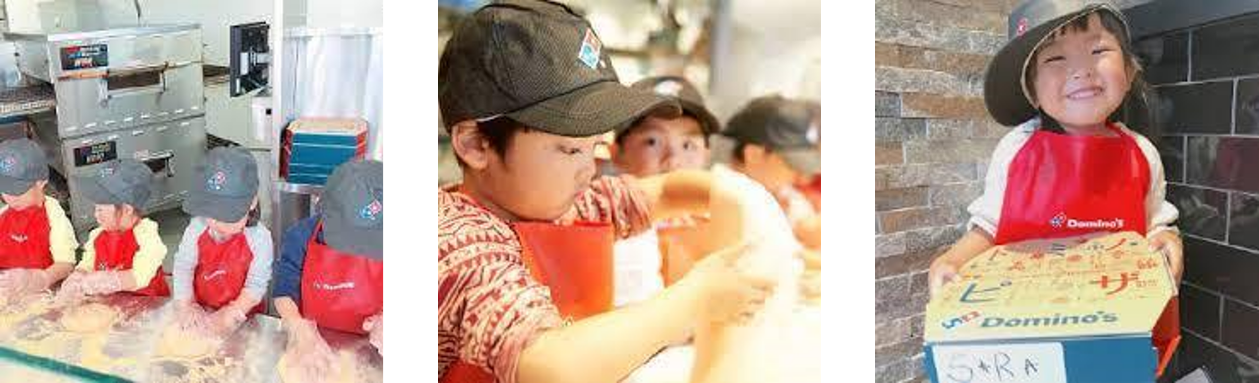 内容:ピザ作り体験、ピザお持ち帰り、認定証授与、ドミノ・ピザオリジナルのエプロンとキャップをプレゼント