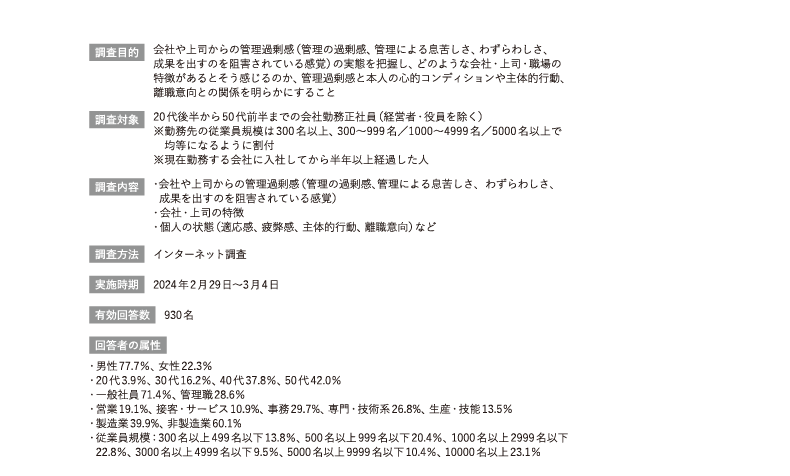 弊社機関誌RMS Message vol.74(2024年5月発行)では「オーバーマネジメント-管理しすぎを考える」というテーマで特集を組み、実態を探るための調査を実施しました。会社や上司による管理は、組織としての効率性やリスク回避の観点から必要なことです。従業員の成果創出や安全配慮義務の履行を目的とした管理もあります。ただし、その管理が行きすぎると、従業員としては息苦しい、わずらわしいと思うこともあるかもしれません。どのような管理がどれくらい行われると過剰だと感じるかは、個人の感じ方や置かれた状況によっても異なるでしょう。そこで本調査では、会社や上司からの管理をどの程度過剰だと感じているかという「管理過剰感」の把握を試み、その要因や影響を検討しました。