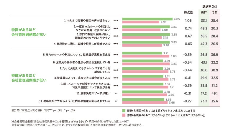 ・反対に、「7.たとえ失敗してもチャレンジすることを奨励している」「10.意思決定スピードが速い」「11.現場判断ができるよう、社内外の情報が開示されている」という状態にあると会社管理過剰感は低い。