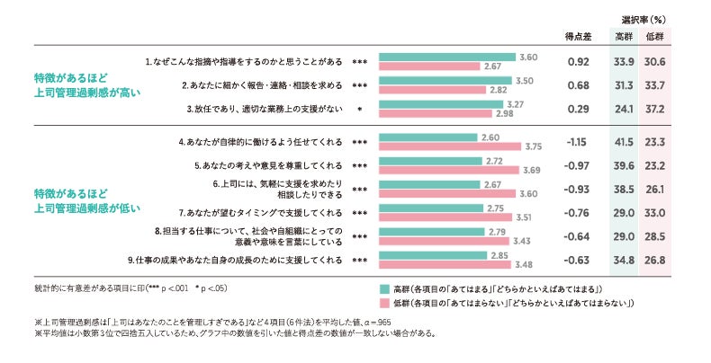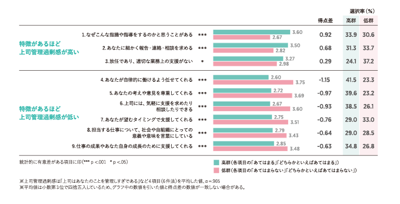 ・「1.なぜこんな指摘や指導をするのかと思うことがある」という懐疑心や「2.あなたに細かく報告・連絡・相談を求める」というマイクロマネジメントの要素があると上司管理過剰感は高い。