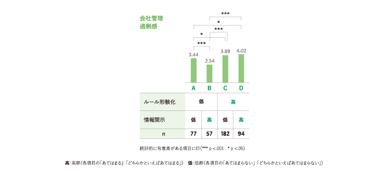 ・一方、ルールが形骸化している場合(CとD)、情報開示の程度にかかわらず会社管理過剰感は高い。