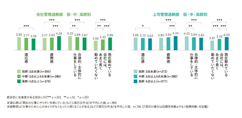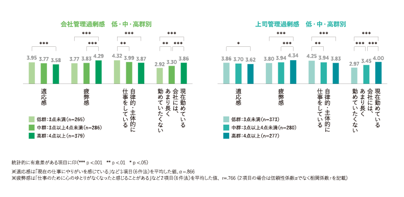 会社や上司の管理過剰感が高いと、社員の適応感や主体性は低下し、疲弊感や離職意向が上昇