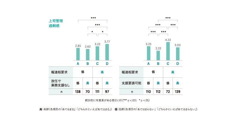 ・上司管理過剰感は、報連相を細かく求められている状態において(CとD)、放任で業務支援がないと高く(左側のD)、上司に支援要請できると低い(右側のD)。