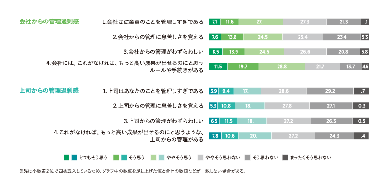 ⇒管理過剰感があるという人の割合は、会社からの方が上司からに比べて高いようだ。
