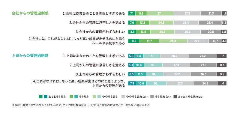 ・会社からの管理過剰感について、「1.会社は従業員のことを管理しすぎである」「2.会社からの管理に息苦しさを覚える」「3.会社からの管理がわずらわしい」の設問に対して、管理過剰感がある(「とてもそう思う」「そう思う」「ややそう思う」)という回答は、それぞれ46.3%、45.9%、46.9%と5割弱だった。一方、「4.会社には、これがなければ、もっと高い成果が出せるのにと思うルールや手続きがある」は60.0%とやや選択率が高かった。