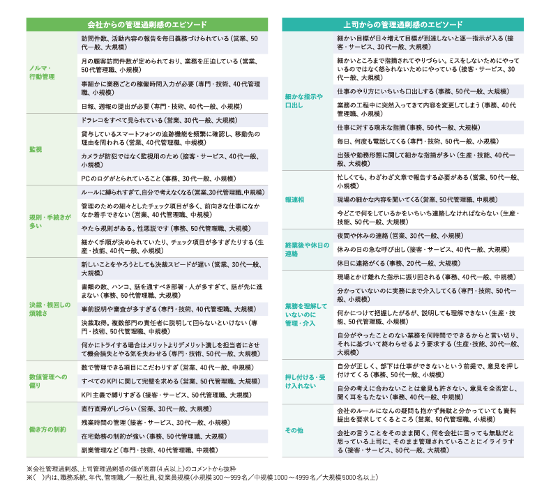 ●会社からの管理過剰感については「ノルマ・監視・規則」など、上司からの管理過剰感については「細かな指示・報連相・介入」などの具体的なエピソードが確認された(図表2)