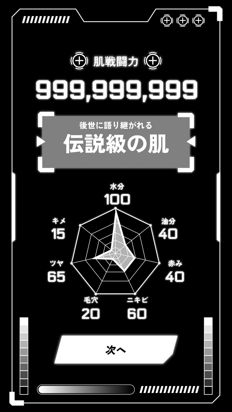 専用モニターで肌をスキャンし、肌に必要な7つの要素(例:うるおい・キメ・ハリ など)に分けて解析し、「肌戦闘力レベル」として可視化します。QRコードを読み取ると、診断結果を画像として保存することができるので、SNSでシェアすることも可能です。
