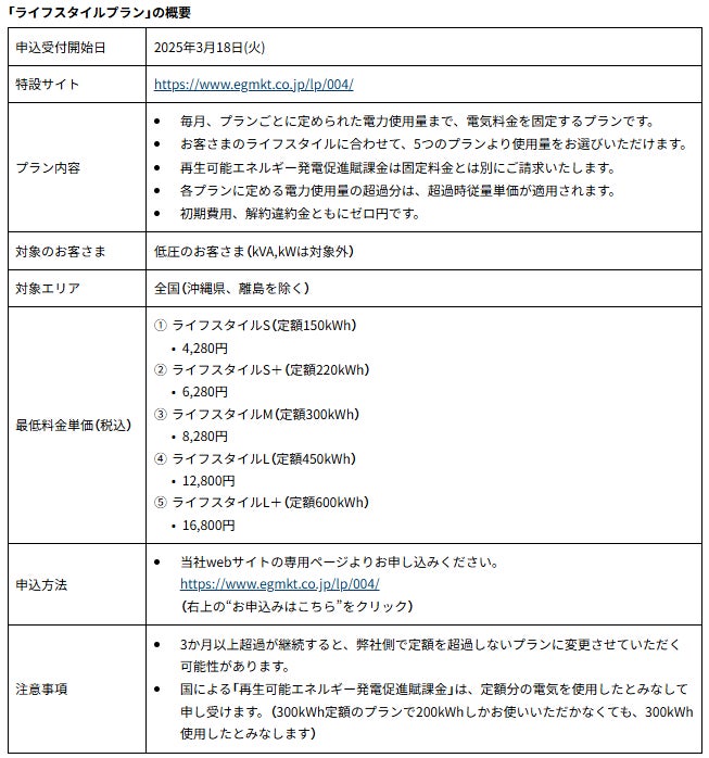 イーレックス株式会社のグループ会社であるエバーグリーン・リテイリング株式会社(本社:東京都中央区、代表取締役:田中 稔道)は、低圧のお客さまを対象に、一定の電力使用量まで電気料金が定額となる、変動ゼロ※の新たな電力プラン、「ライフスタイルプラン」の販売を開始したことをお知らせします。