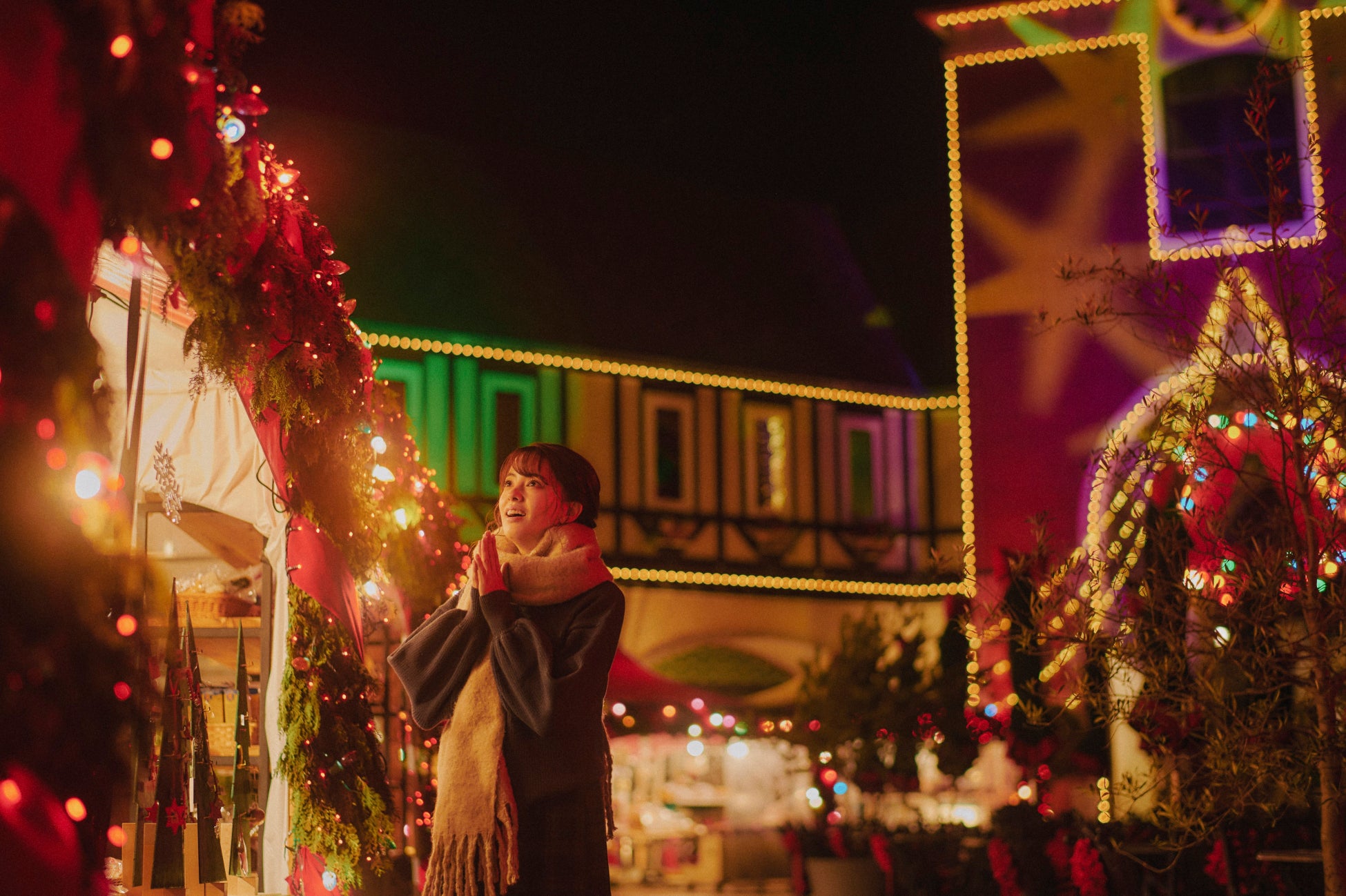 。夜空にそびえる森のクリスマスツリーとともに、周辺の森、メタセコイア等のライトアップもエリアを拡⼤し、⼼温まるクリスマス空間が誕⽣します