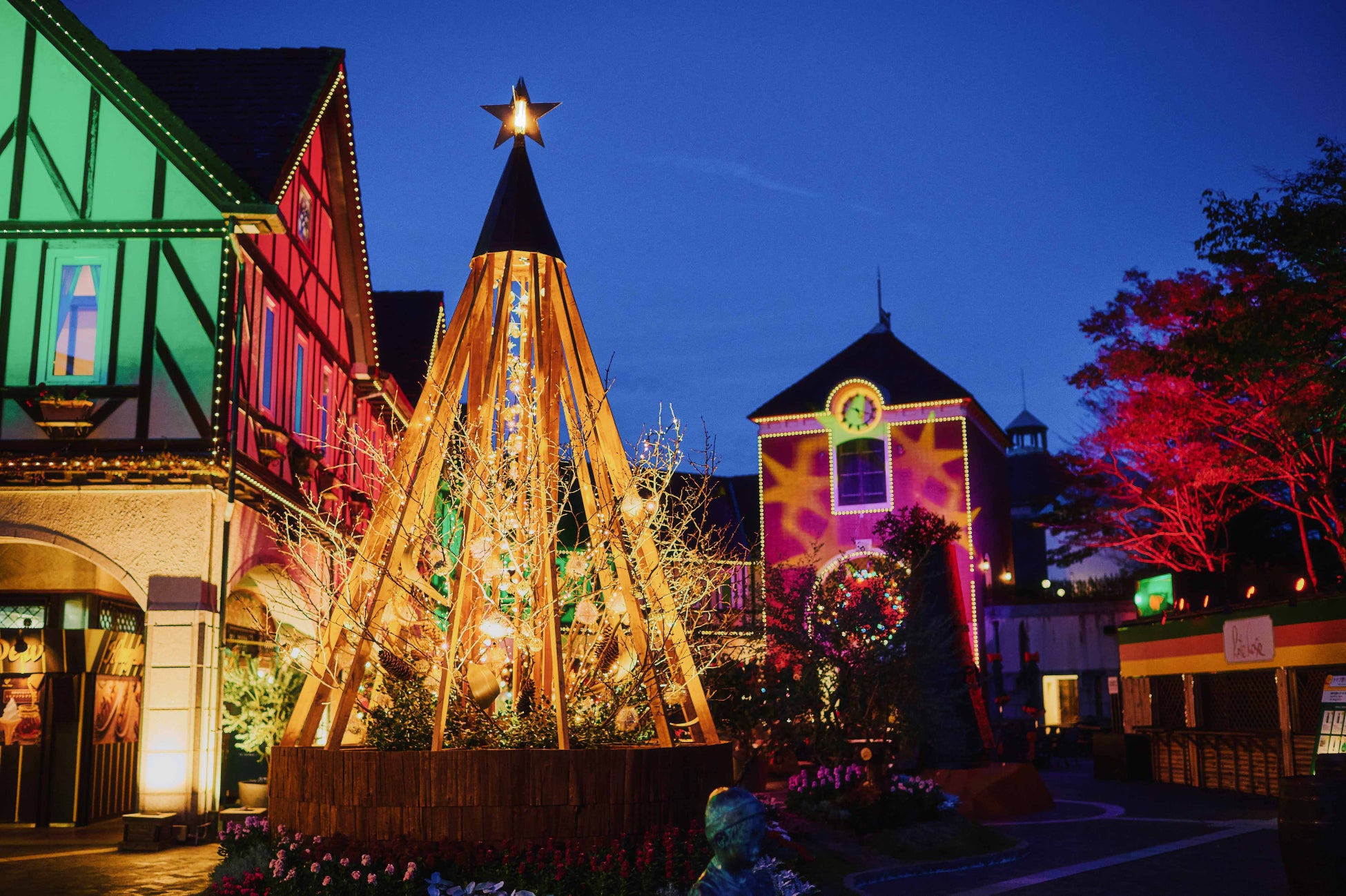 ★夕刻からはイルミネーションが点灯され、タワーが煌めき立ち、建物、森の木々が光で浮かびあがる幻想的な空間に