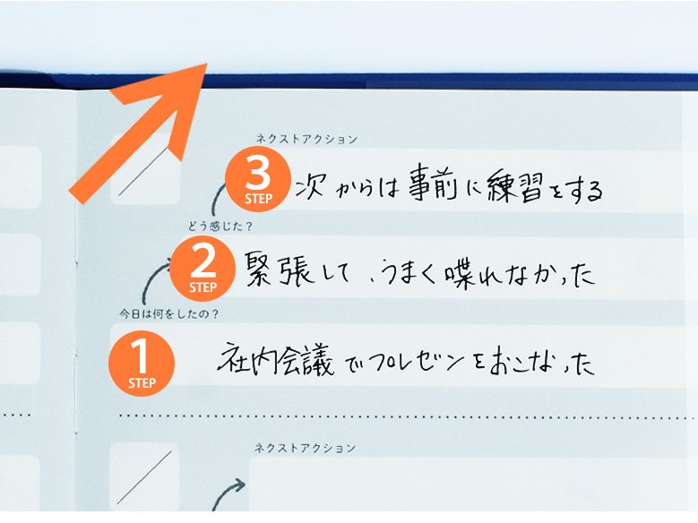 3STEP日記の特長は今日の出来事・気づき・次への行動(ネクストアクション)を3行・3段階にわけて積み上げ型で記入する形式です。日付を自分で書き込む日付フリー形式を採用した事により、いつからでも始める事ができる、書けなかった日が空白にならず自分のペースに合わせて無理なく続ける事が可能です。