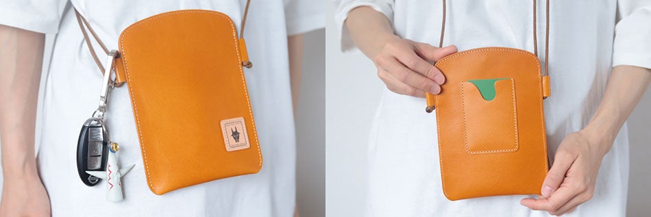 マチがなくスリムな形状で最低限のものが入るスマホポーチです。裏側にはカードやチケットが入るポケット付き。