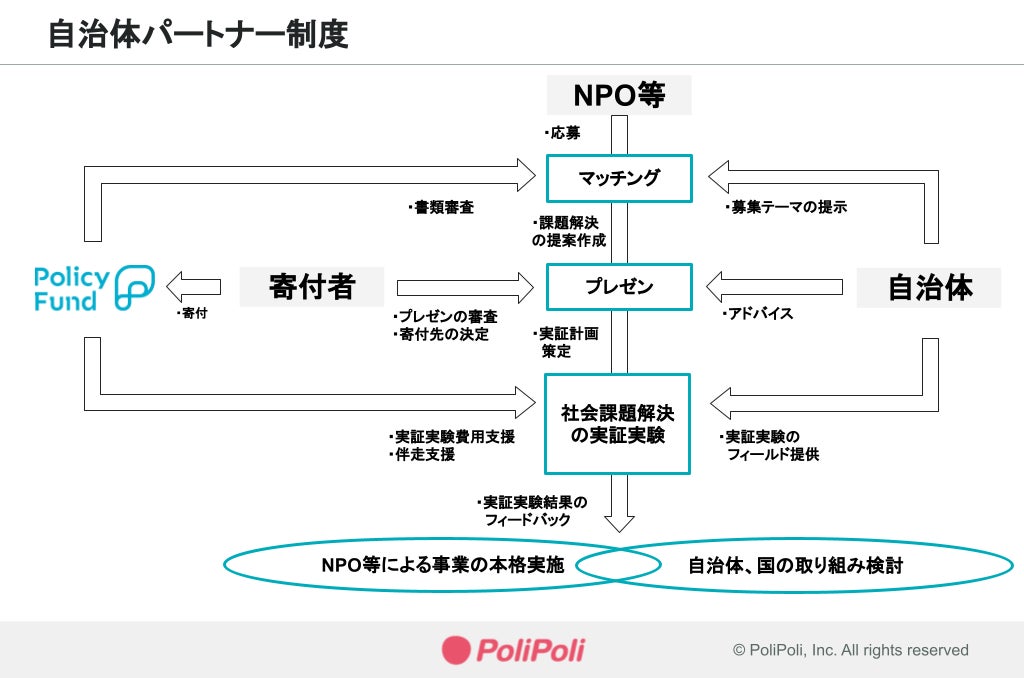 本制度では、非営利団体や企業による社会課題解決のための企画及びアイデアを募集し、自治体パートナーの地域をフィールドとした実証実験を経て、社会課題解決に向けた取組の実現を目指します。