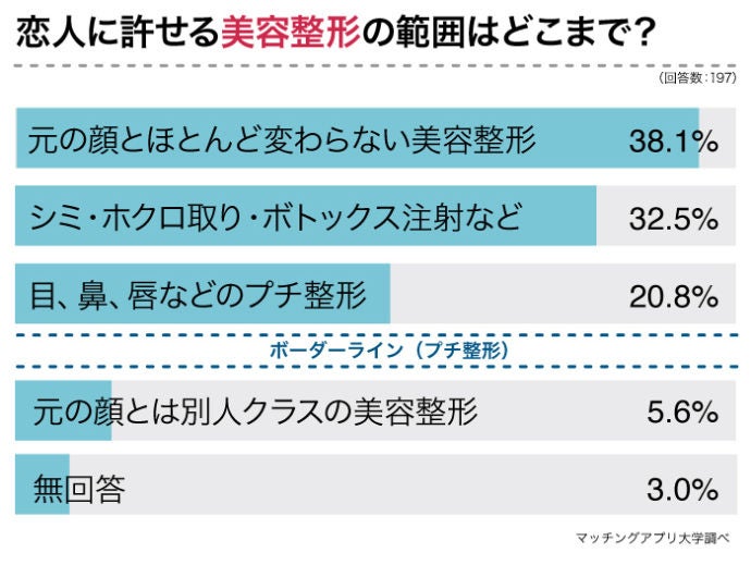 恋人について美容整形を許容できる範囲は、「元の顔とほとんど変わらない美容整形」(38.1%)が最も多く、次いで「シミ・ホクロ取り・注射など(ヒアルロン酸やボトックス注射)」(32.5%)、「目、鼻、唇などのプチ整形」(20.8%)でした。
