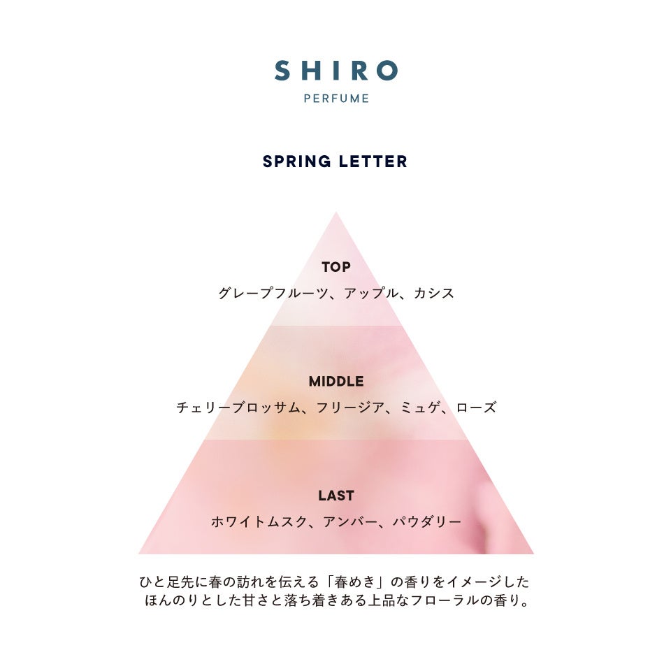 SHIRO PERFUME から、ひと足早く開花を迎えるほんのりピンク色の桜“春めき”をイメージした「SPRING LETTER」の香りが数量限定で登場します。まだ少し肌寒い日に香らせたい3アイテムが揃います。