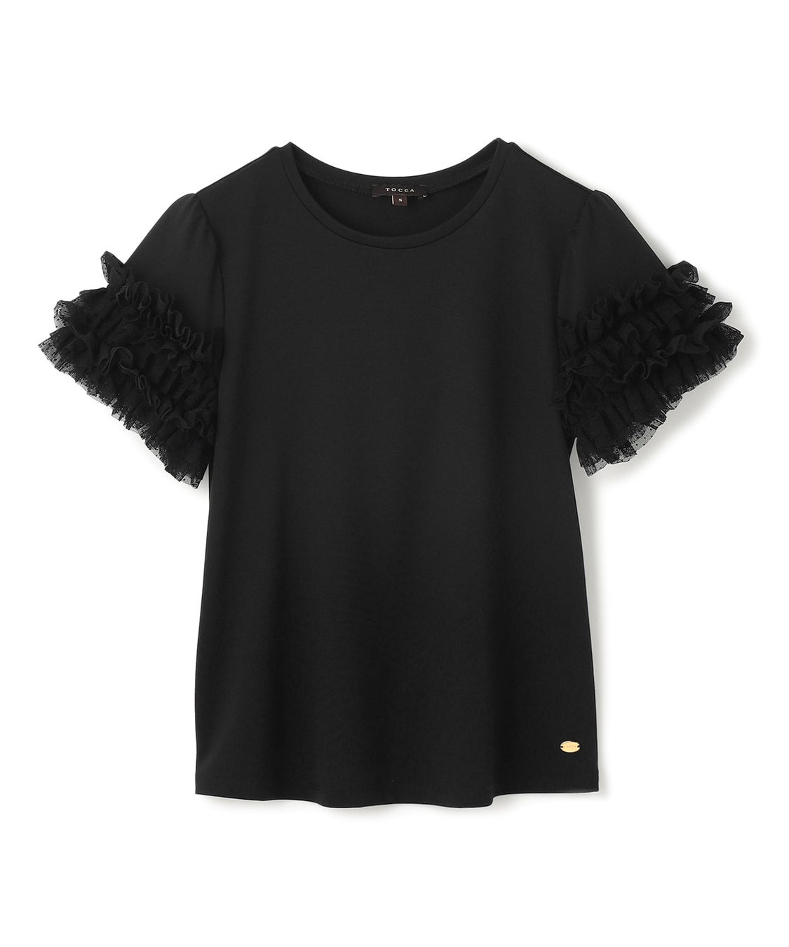 商品説明:袖部分に施されたドットチュールのフリルが愛らしい印象のTシャツ。シンプルながら袖のボリューム感が、あらゆるコーディネートも一気に格上げしてくれる、色違いで欲しくなる万能Tシャツです。