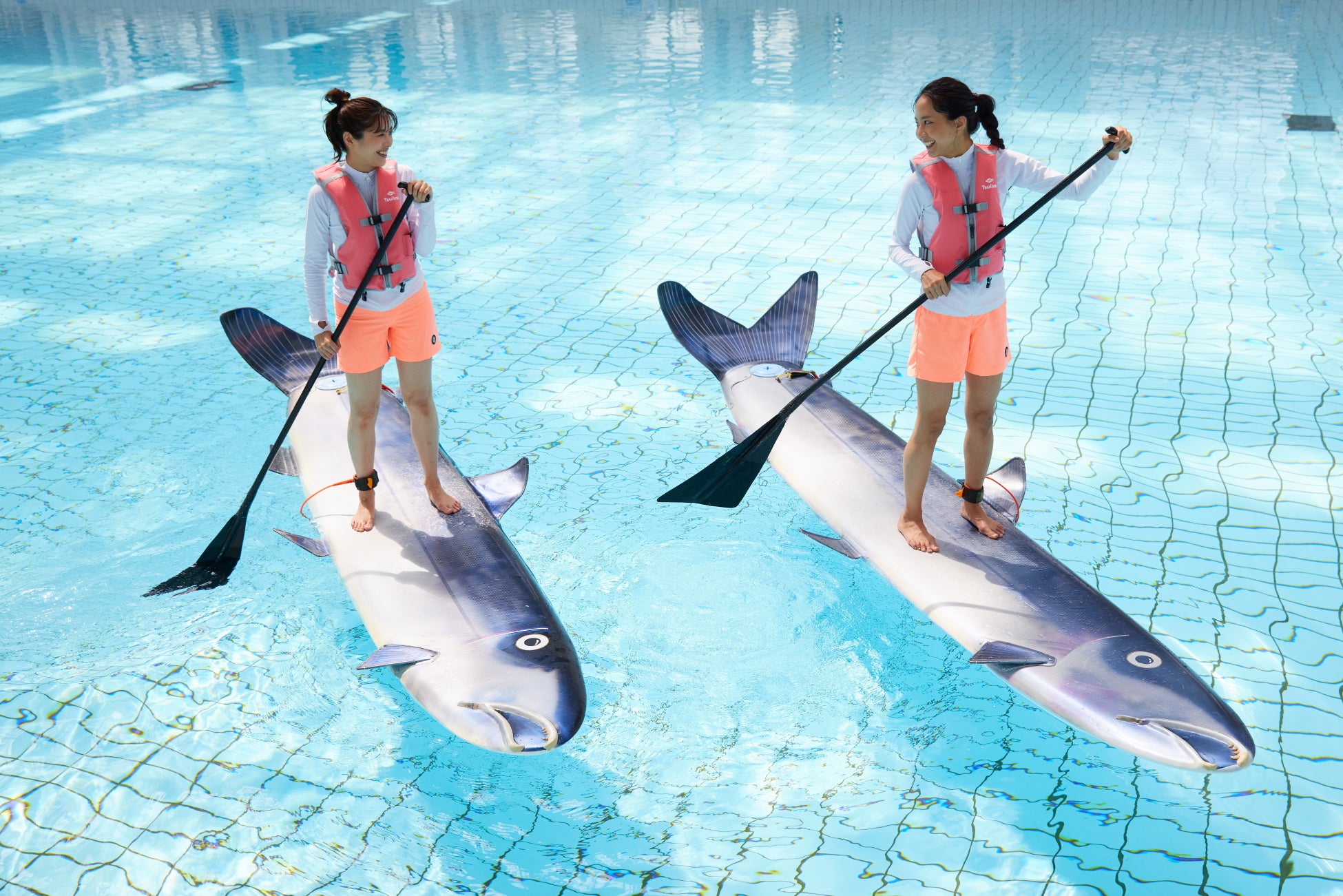当プランで宿泊できるのは、鮭の切り身や鮭の姿がデザインされた家具やファブリックで設えた鮭ルームです。ベッドルームは、川を泳ぐ鮭を表現した空間で、ベッドフレームには、川で鮭を狙う親子のクマが描かれています。鮭をモチーフにしたナイトキャップと、パジャマを着ると、鮭になった気分を味わえます。客室の展望ジェットバスで楽しめるのは、いくら丼をイメージしたお風呂です。入浴剤でご飯のような見た目になったお風呂に、いくらをイメージしたボールを加えると「いくら丼風呂」の完成です。また、滞在中には鮭が川を遡上しているかのような体験ができます。施設内のインドアウエーブプール「ミナミナビーチ」で鮭がデザインされたSUP(*2)に乗って水上を進むアクティビティです。鮭になりきって楽しめます。