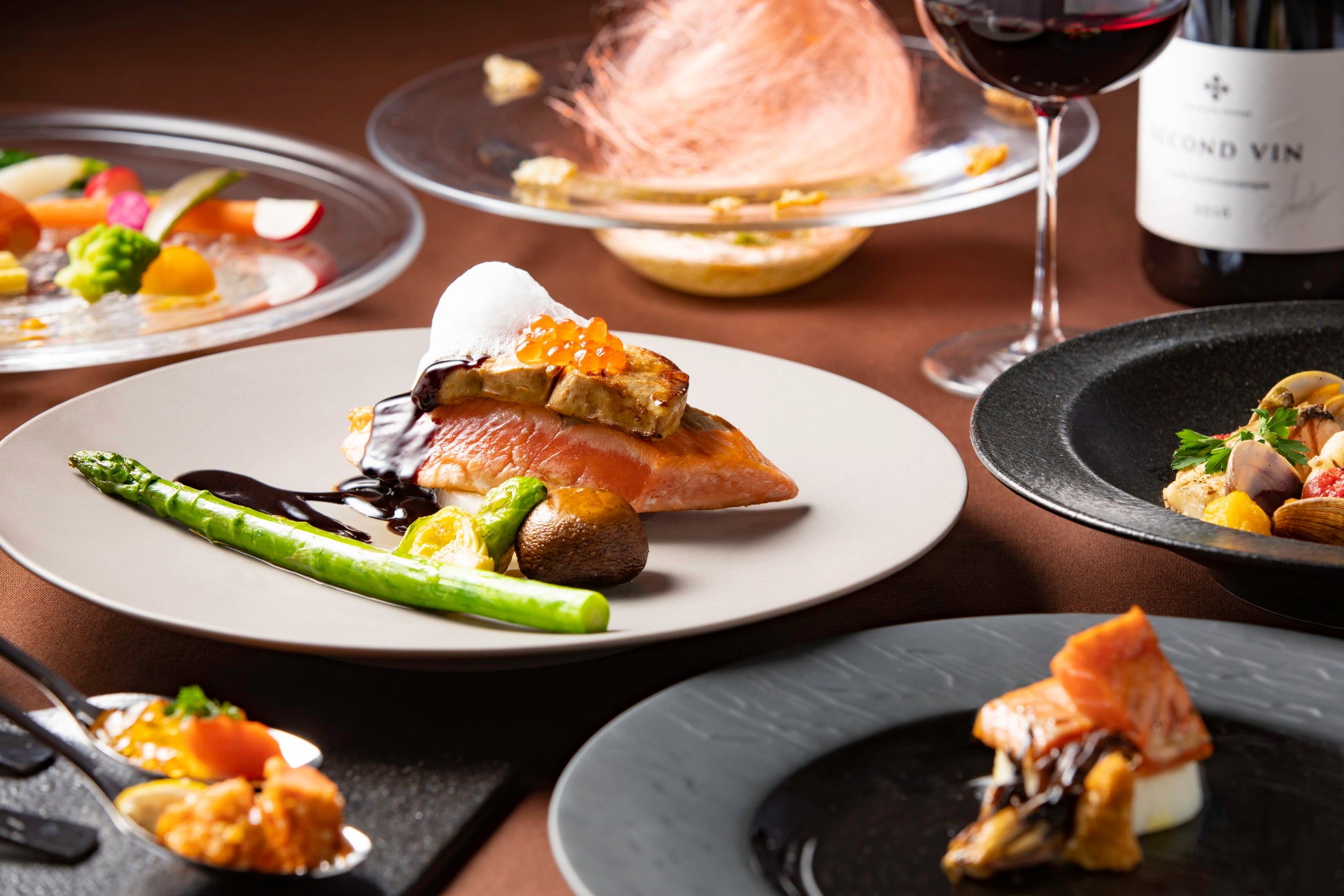 鮭のさまざまな部位を使ったコース料理を提供します。鼻先から背や腹まで、それぞれを「焼く」「煮る」「揚げる」「凍らす」「蒸す」という調理法を用いて、鮭を余すところなく提供します。メインは鮭のフィレといくらを使用したメニューです。これは、鮭のフィレをいくら、昆布の泡と合わせた、鮭の身の柔らかさを堪能できる一品です。