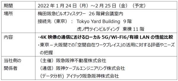 今般、当社は、JR東日本及びKDDIが運営する空間自在コンソーシアムに加盟し、「空間自在ワークプレイス」を新たに大阪の梅田阪急ビルオフィスタワーに設置して、東京の同ワークプレイスとの間で大容量の4K映像を通信する実証実験を開始します。