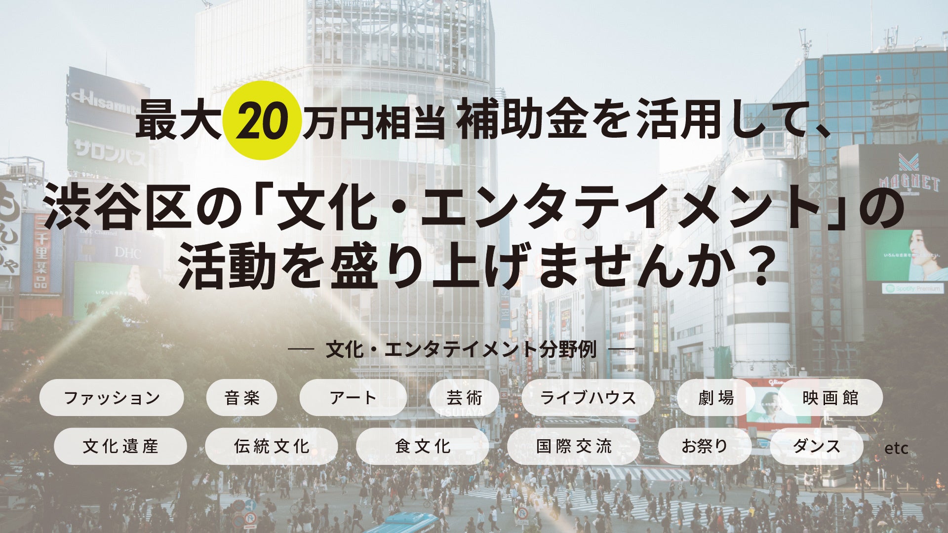 ・「文化・エンタテイメント」分野において、渋谷を盛り上げる活動を募集し、審査で採択された取り組みには、1つの活動につき最大20万円相当を支援いたします。