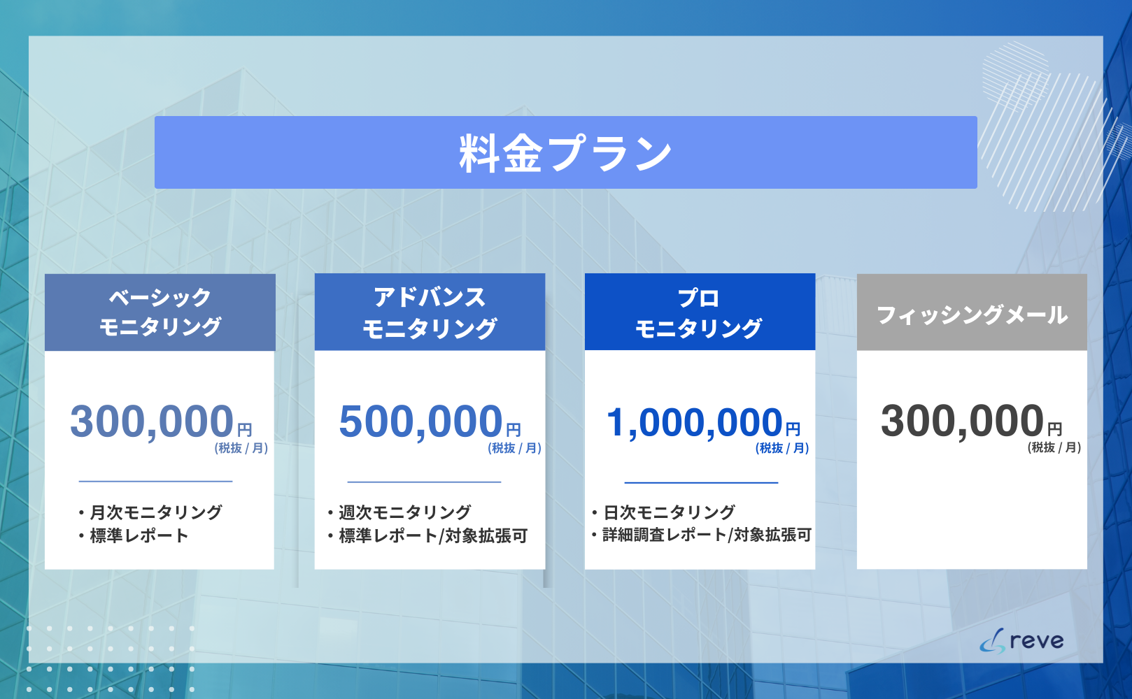 シースリーレーヴでは、30万円〜企業規模やセキュリティ課題に応じて、柔軟に選べる3つのプランをご用意しています。