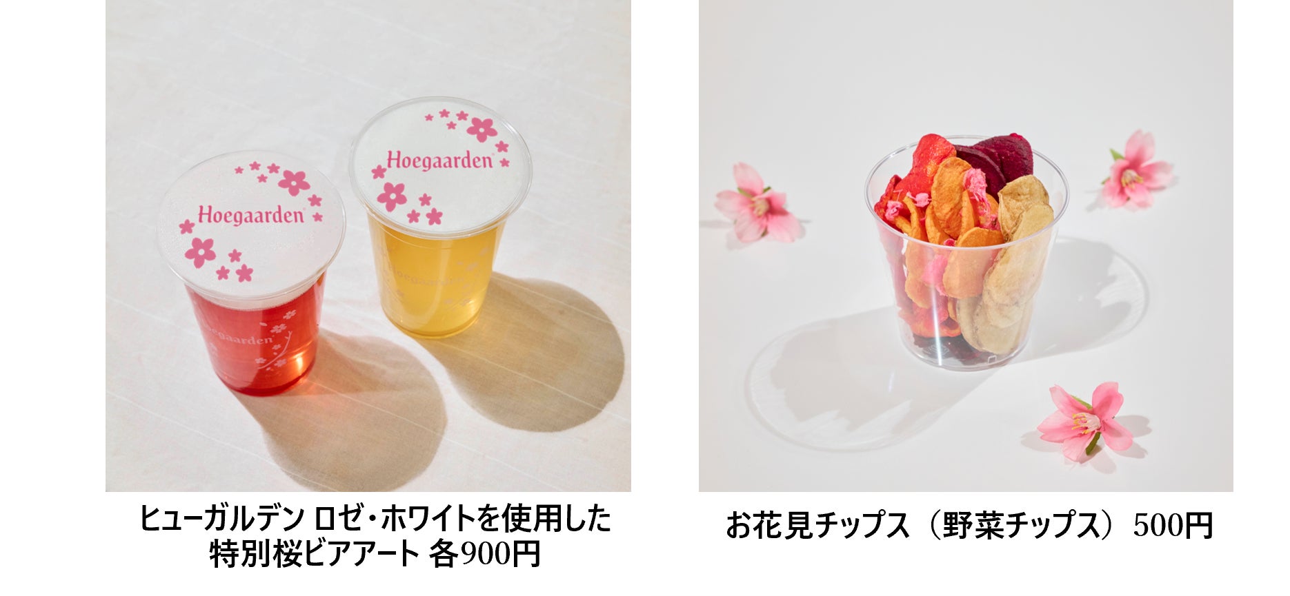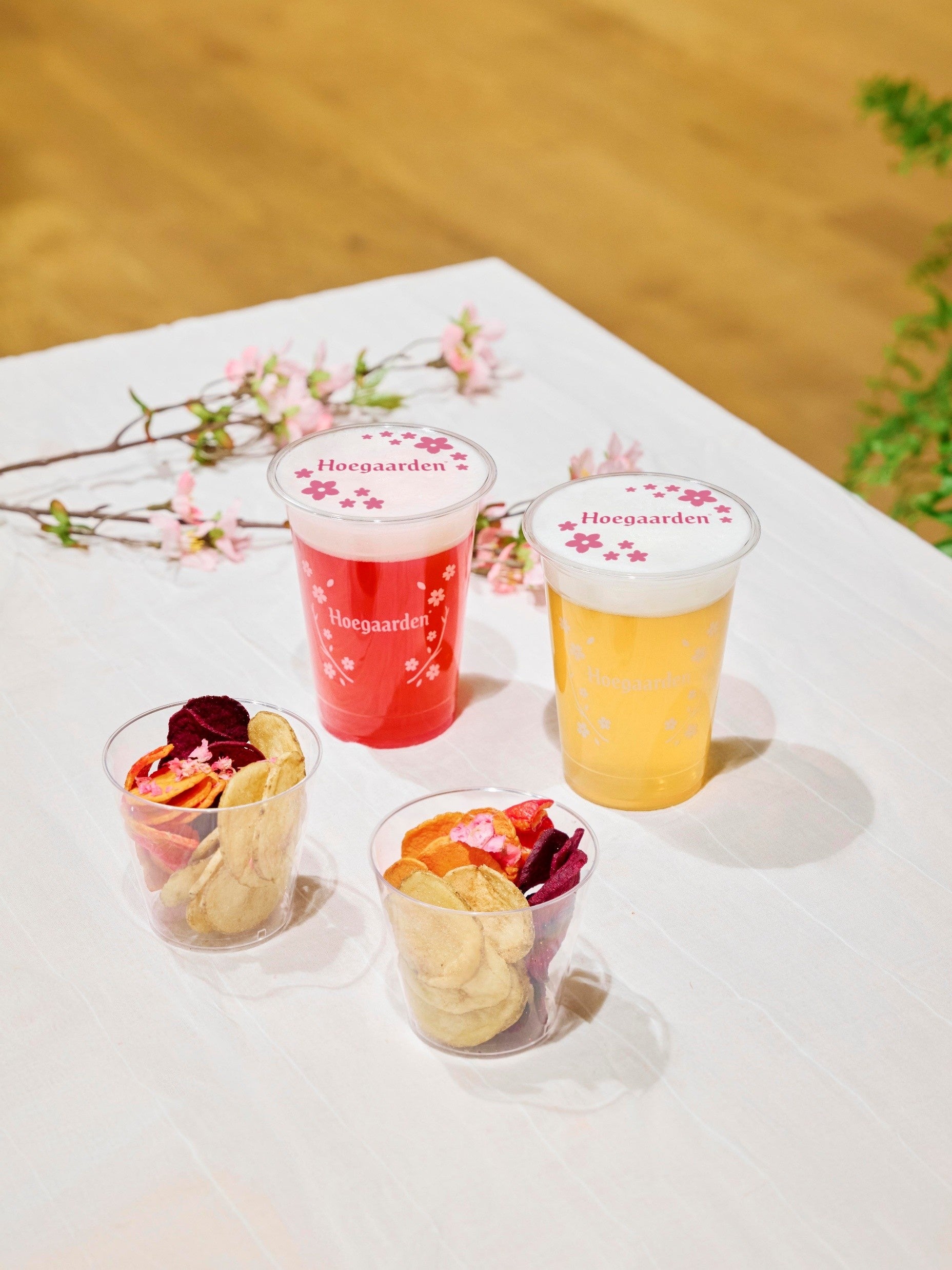 桜の名所・目黒川沿い「「Hoegaarden SAKURA BAR」(ヒューガルデン桜バー)を期間限定でオープン。本イベント限定で楽しめる桜ビアアートが施されたヒューガルデン ホワイト・ロゼと、フードコーディネーターの中本千尋さんが監修した規格外野菜を使い、サステナビリティにも配慮したお花見チップス(野菜チップス)を提供します。ヒューガルデンのフルーティーさと、野菜本来の甘みの相性の良さをぜひお楽しみください。