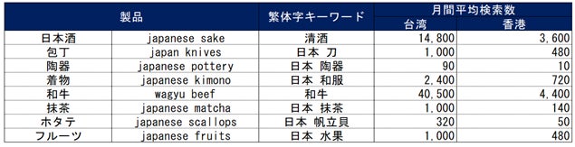 特に、和牛や日本酒に関しては、検索数が多いことが確認されました。和牛や日本酒については、台湾・香港両国において、他製品と比べても検索数が多く、現地市場において高い関心とニーズがあることがわかります。