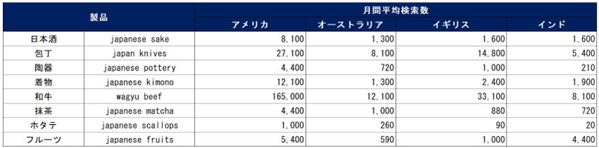 東南アジア圏においては、和牛、着物、日本酒、包丁といった製品に対する検索数が高い傾向があります。