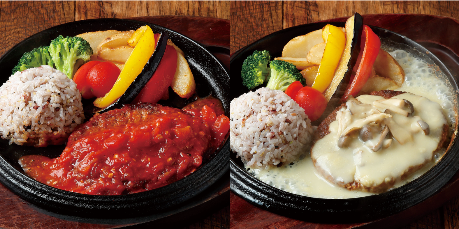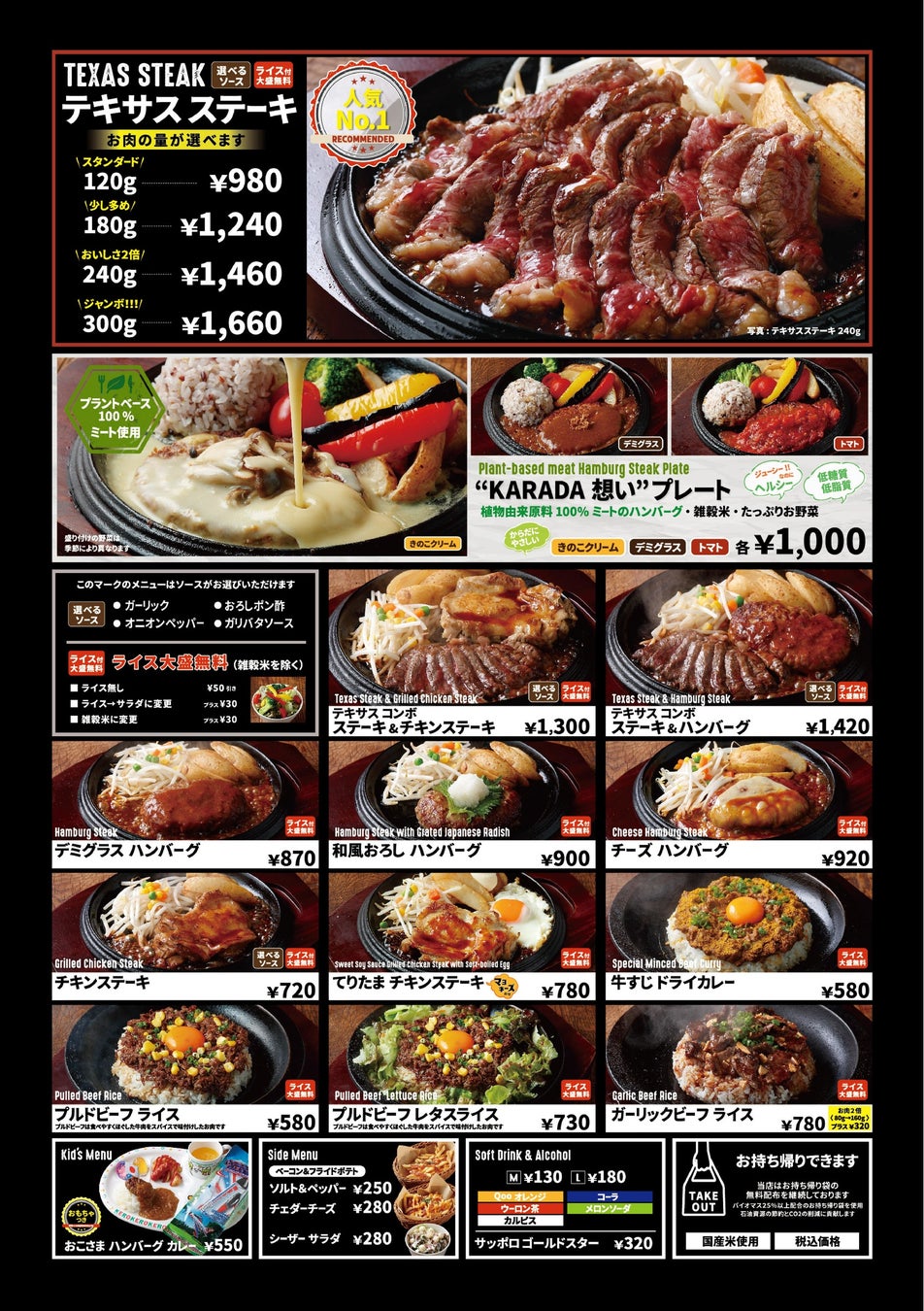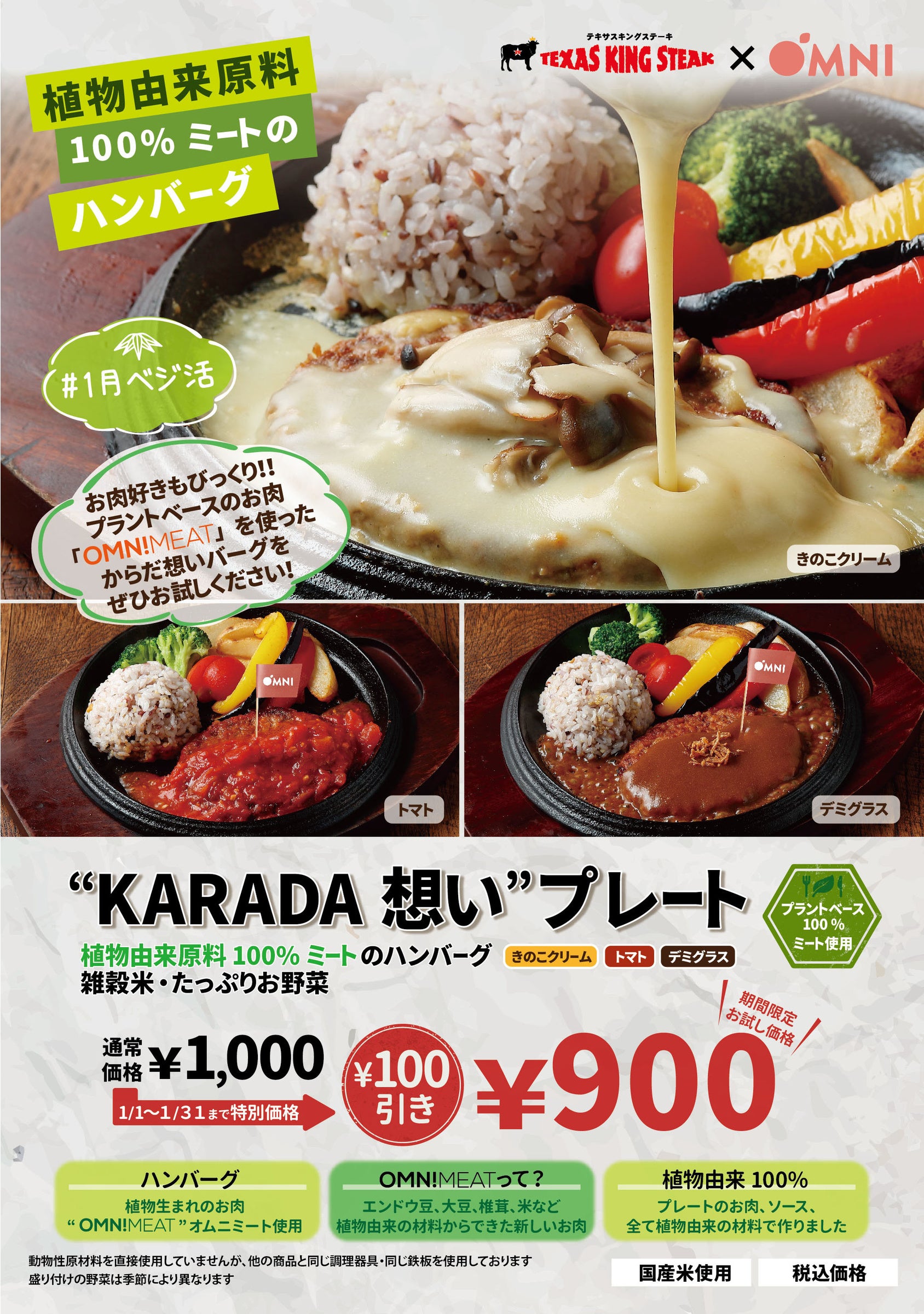 ボリューム感のあるステーキが、あつあつの鉄板で楽しめるフードコートタイプのステーキ専門店「テキサスキングステーキ」。11月にオープンしたイオンモール成田店の限定メニューとしてラインアップする「“KARADA想い”プレート」は、植物由来100%のオムニミートを使ったハンバーグと雑穀米、たっぷりのお野菜をワンプレートにし「ハンバーグが食べたい!」気分を満たしながらも低糖質・低脂肪が叶うヘルシーで身体にやさしいメニューです。お味は「きのこクリーム」「デミグラス」「トマト」の3種類を用意しており、食材にこだわりながらも各1,000円(税込)とお財布に優しい価格を実現。オープンから人気メニューのひとつとして親しまれています。今回は、ホリデーシーズンにたくさんのご馳走を食べた身体をいたわりながらも美味しいお食事をお楽しみいただけるよう1月1日(土)から1カ月間の期間限定で100円OFFにてご提供します。我慢せずにヘルシーに、あつあつのハンバーグプレートをお召し上がりください!
