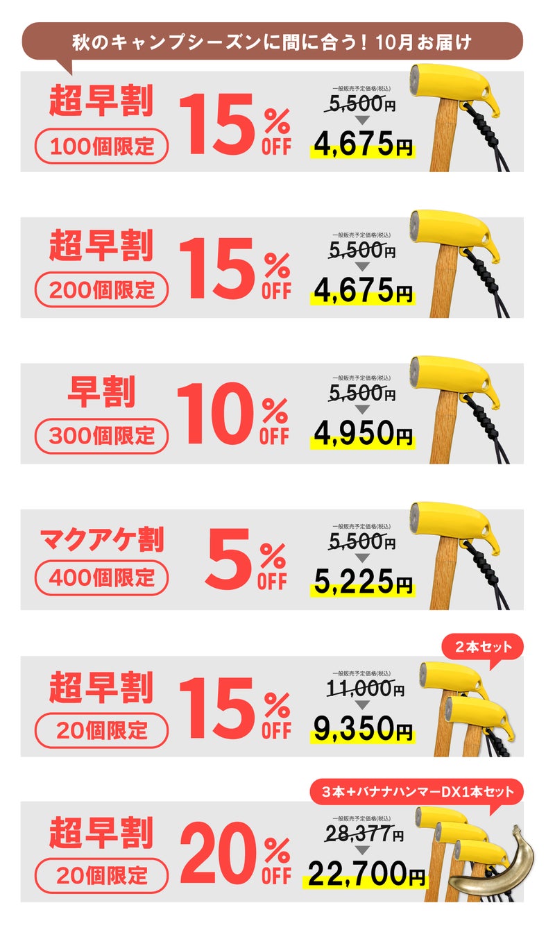 お得にご購入できる「超早割」「早割」「マクアケ割」をご用意致しました。単品だけでなく、「2本セット」や「3本+バナナハンマーDXセット」も!