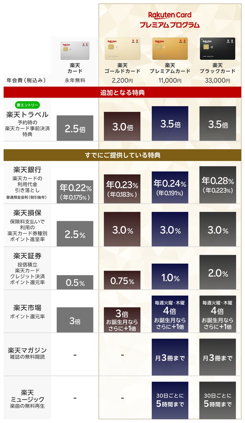 「楽天カードプレミアムプログラム」は、「楽天ブラックカード」、「楽天プレミアムカード」、「楽天ゴールドカード」の会員様を対象に、楽天グループの各サービスをよりお得で便利にご利用いただけるプログラムとして提供しております。