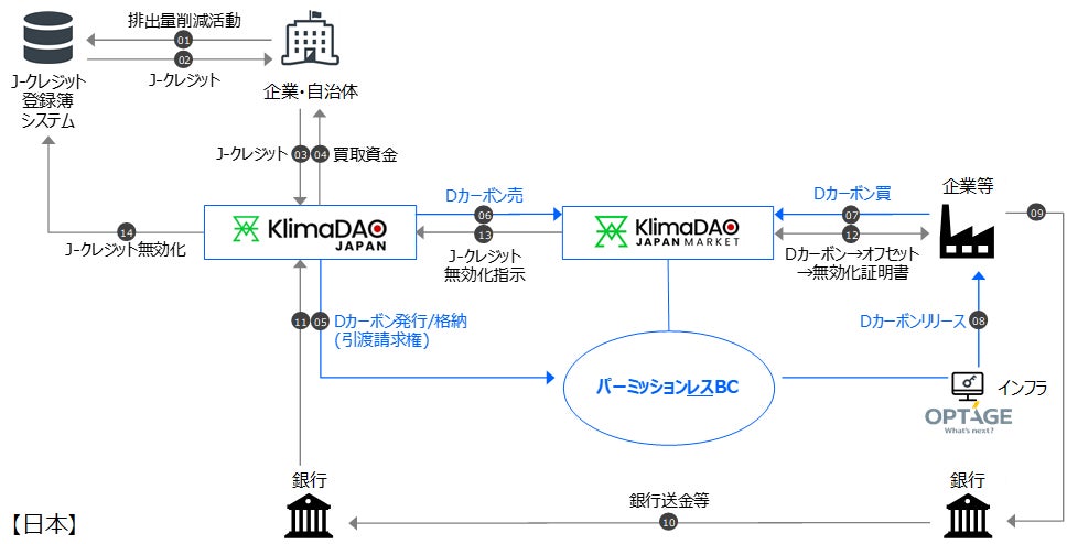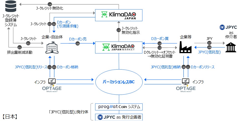 Dカーボンは、KlimaDAO JAPANが企業・自治体から買い取ったJ-クレジット等に対する引渡請求権を、グローバルにアクセス可能なパーミッションレスブロックチェーン上のトークンとして発行するものです。当該ブロックチェーンにアクセスしDカーボンを管理するために必要な企業向けインフラをオプテージが提供し、銀行送金等での資金決済とすることで、まずは企業が取引参加しやすい環境で市場開設する想定です。