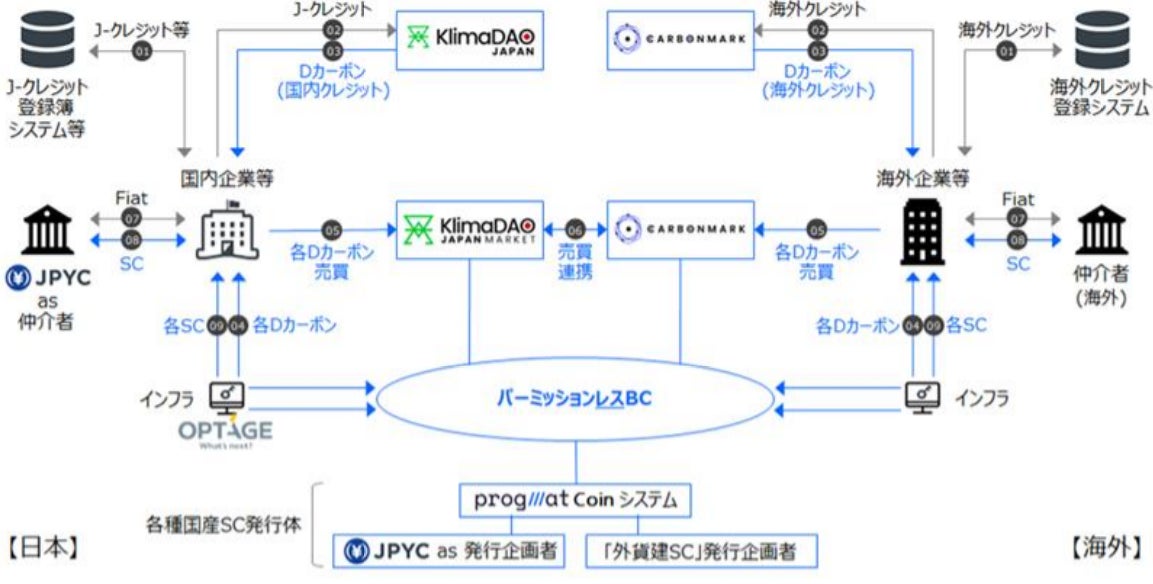 KlimaDAO JAPANが開設予定のブロックチェーンを活用したDカーボンマーケットプレイス「KlimaDAO JAPAN MARKET」と「Progmat Coin」基盤が連携し、オプテージが企業向けインフラを提供することで、本邦初となる高い透明性・信頼性・効率性を担保したカーボンクレジットの企業間売買が実現可能となります。さらに、KlimaDAOが既にグローバルで展開しているマーケットプレイス「Carbonmark」と連携し、決済に各種国産SCを用いることで、クロスボーダーで世界規模の流動性創出を目指します。