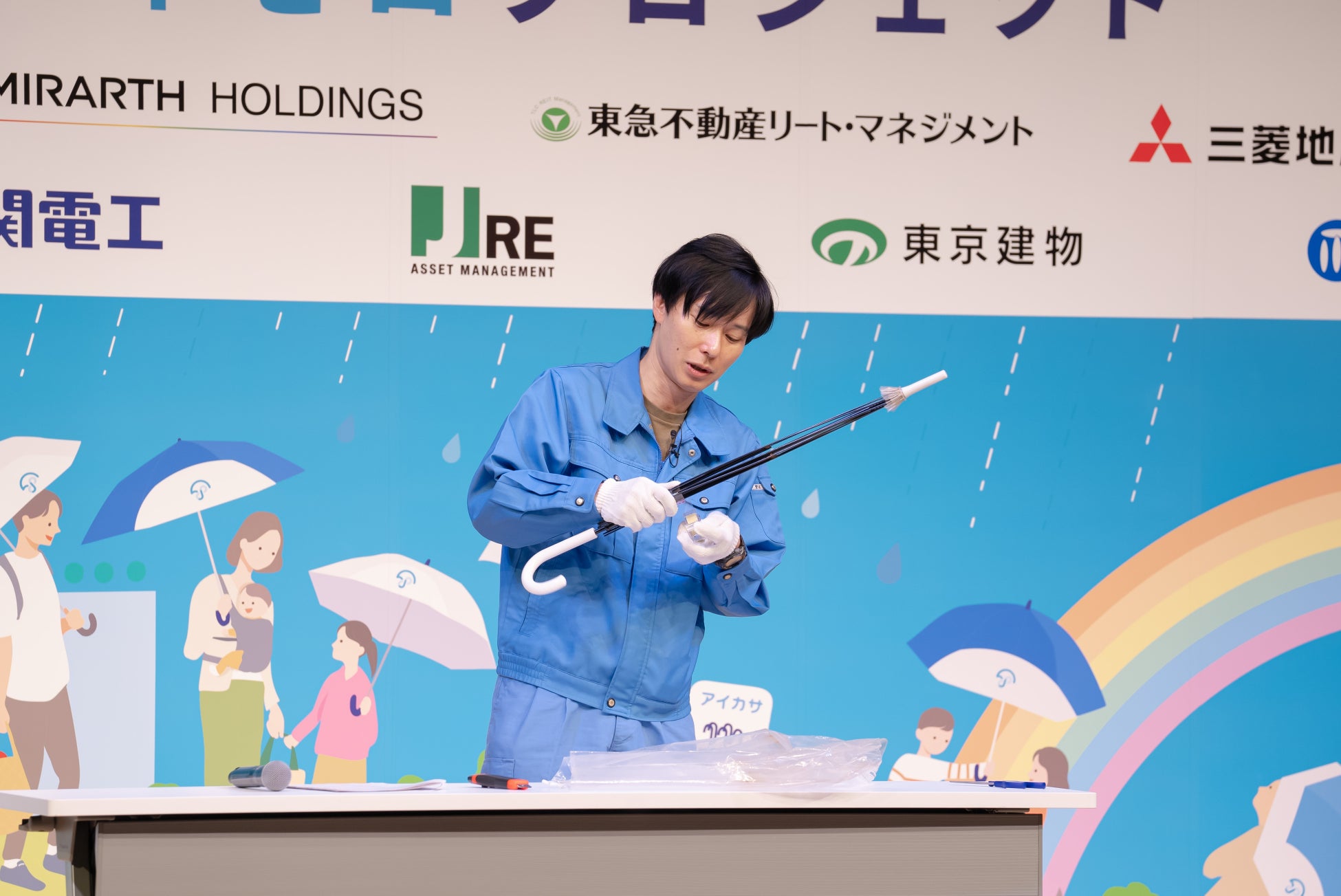 「2030年使い捨て傘ゼロプロジェクト」成果発表会では、環境省サスティナビリティ広報大使をつとめゴミ清掃員としても活動するお笑い芸人 マシンガンスの滝沢秀一さんが、ビニール傘の廃棄の仕方について実演しました。ビニール傘の廃棄方法自治体によっては異なりますが、その中でも、丁寧に分別をしなくてはいけない例を紹介し傘ゴミ削減のための工夫を共有しました。