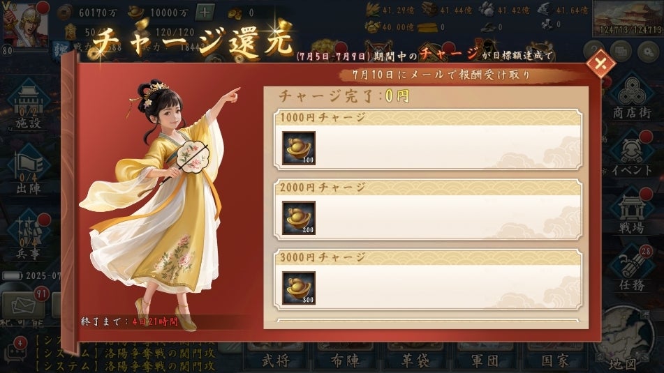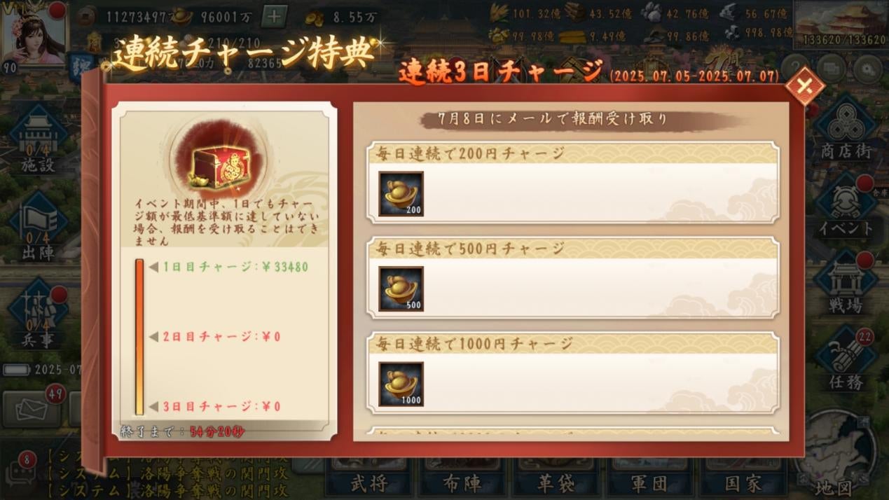 ログインボーナスで新UR好感度宝箱(全)を獲得できます。合計10日間ログインすると、UR武将の好感度を合計で150獲得可能です。