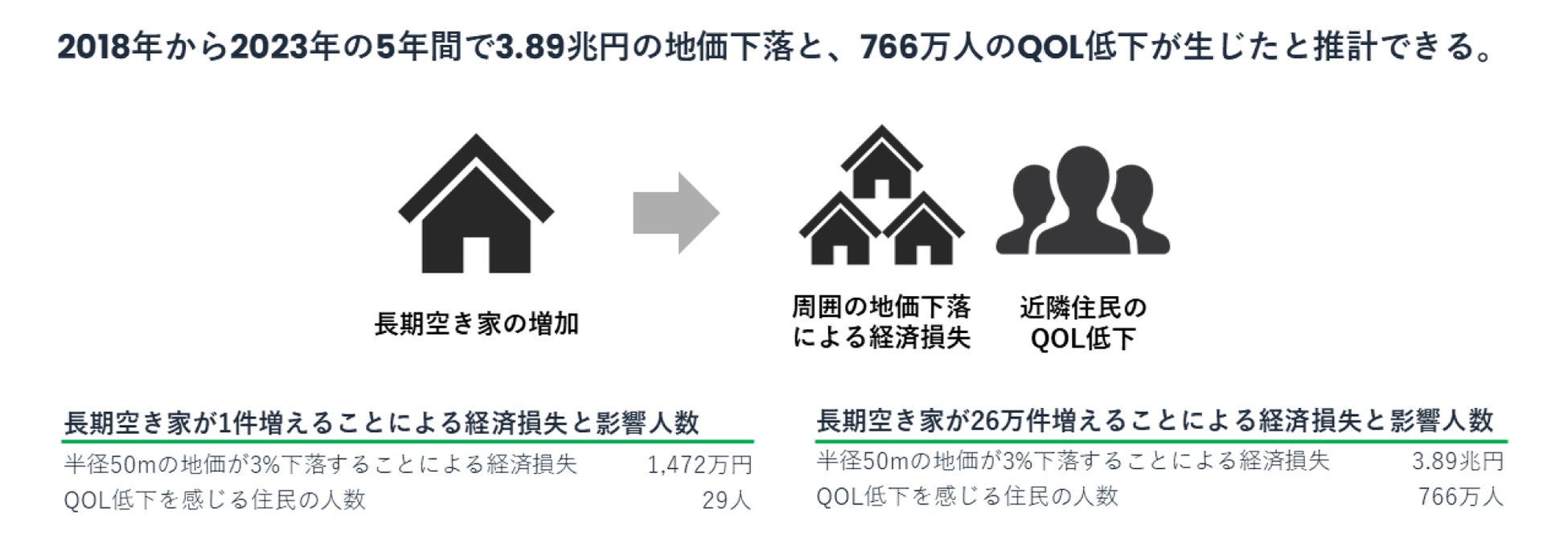 本コンソーシアムに参画する東京大学連携研究機構不動産イノベーション研究センター(CREI)の研究結果によると、50m以内の長期空き家数が1軒増えるごとに周辺の住宅の取引価格が約3%低下することが明らかとなっており(※2)、クラッソーネ実施した「「空き家」に関する住み心地調査」では、回答者の半数が「空き家があることによって町の住み午後値が下がる」と回答していることから、長期空き家の増加は、日本経済や近隣住民のQOLに悪影響を及ぼすことが明らかとなっています。本コンソーシアムでは、2018年から2023年の5年間で増加した「賃貸・売却用及び二次的住宅を除く空き家(戸建)」33万件の8割にあたる26.4万件が「近隣住民のいる長期空き家」と推定すると、3.89兆円の地価下落と、766万人のQOL低下が生じたと推計しています。