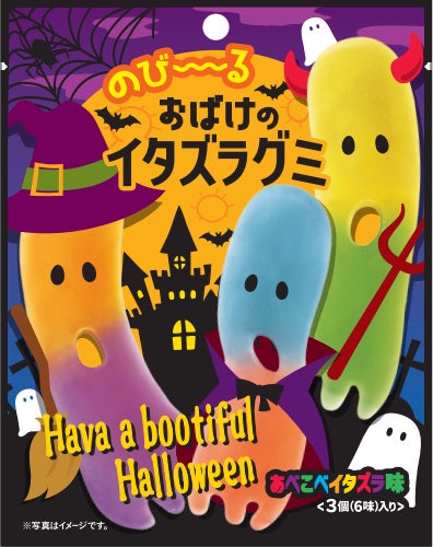 商品特徴:あべこべイタズラ味のグミが3個(6味)入り。のびーる食感が楽しめるおばけ型のハロウィン限定グミです。食べ応えのある大きさと、見た目とあべこべの味がユニークな商品。