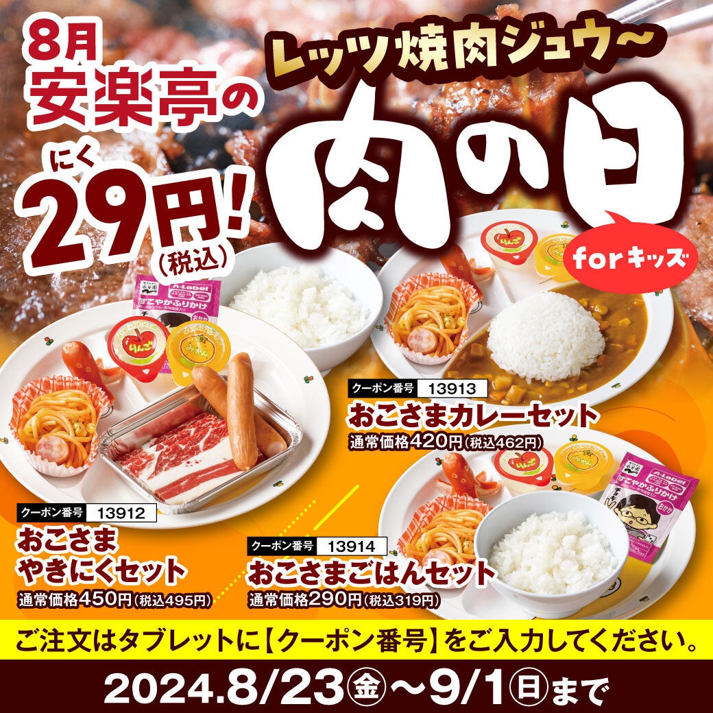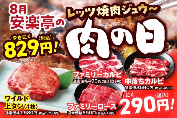 夏休みの〆は安楽亭の肉の日で焼肉ジュウ~しよう!人気の焼肉カルビやロースが290円(税込)!キッズメニュー3種が29円(税込)!さらに!極厚タン「ワイルド上タン」が829円(税込)で登場。