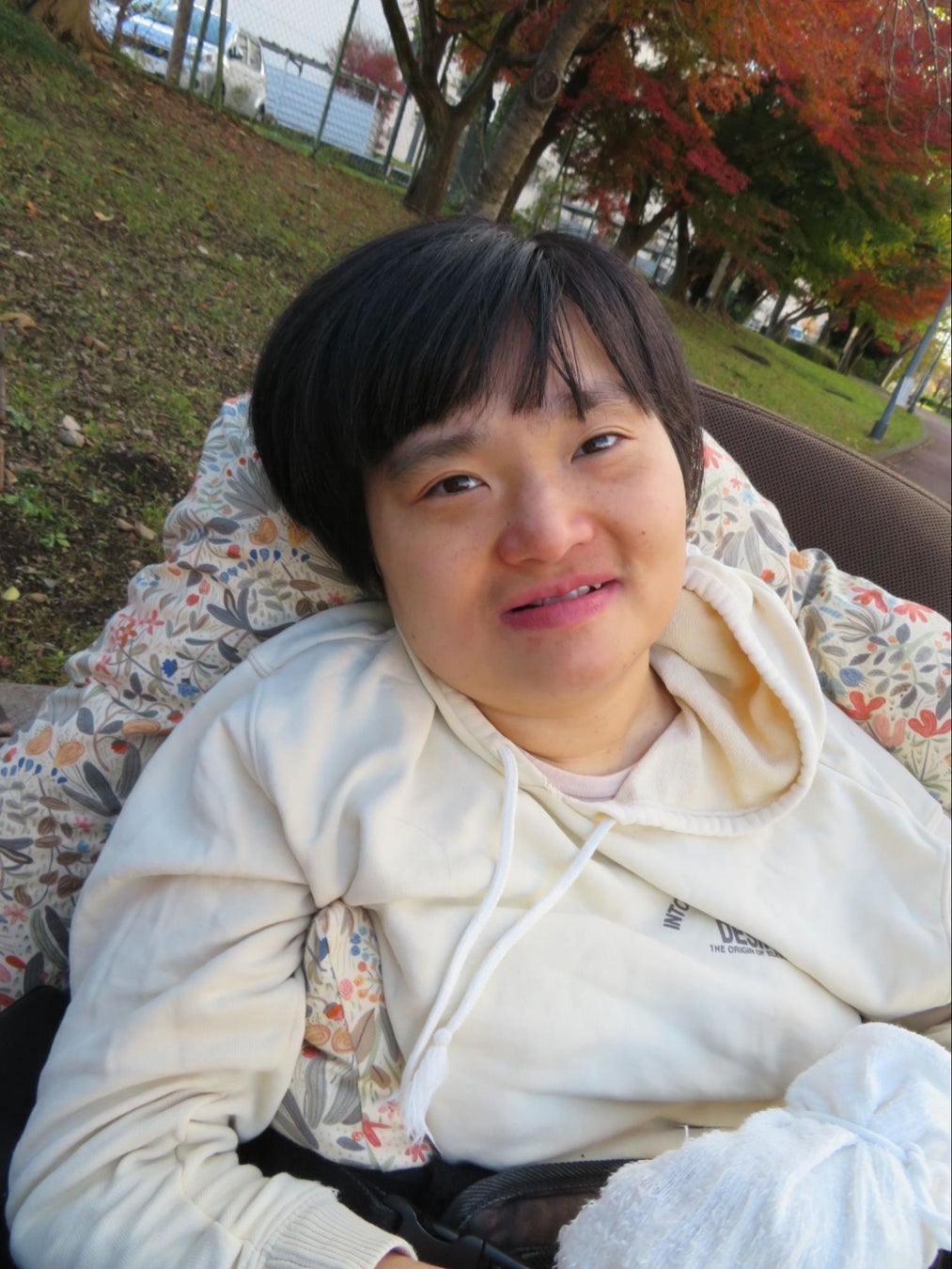 身体を動かすこと、楽しいことが大好き。テーマに沿った景色や音楽を身体で感じてイメージしながら楽しく描いています。絵の具を付けた両手を大きく動かして、力強くキャンバスに叩くように描きますが、優しく暖かいタッチの出来上がりになります。出来上がった自分の絵を見てニッコリ微笑む表情はとても印象的です。