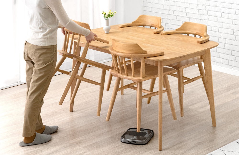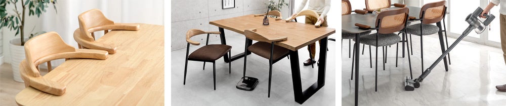 ダイニングテーブルの下を掃除機やロボット掃除機で掃除する際、テーブルやチェアの脚が邪魔になることがあります。今回発売開始した『お掃除ロボット対応ダイニングチェア』は肘掛けをテーブルにかけることでチェアを床から浮かすことができ、脚を気にすることなく掃除ができるようになりました。