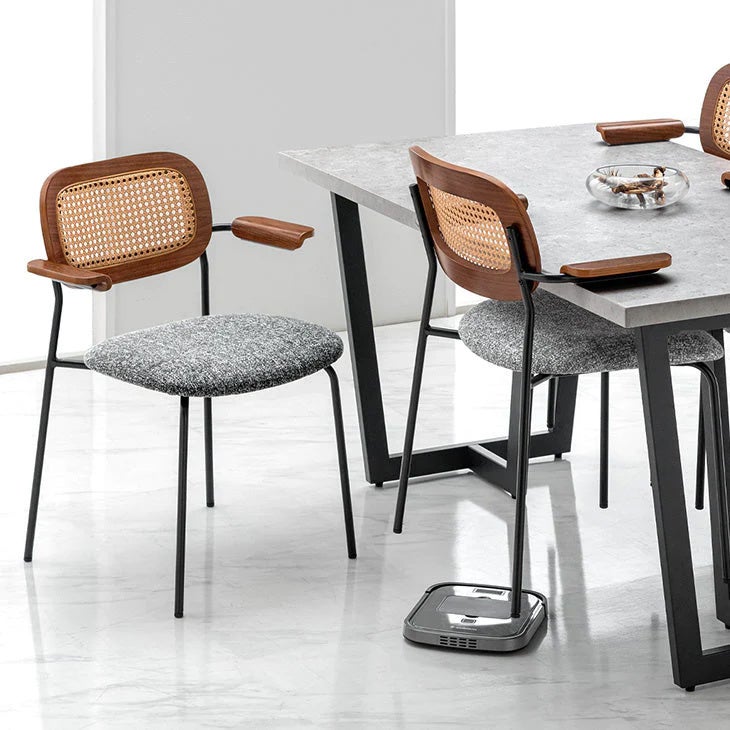 【2】のラタンチェア4脚と、高級感のあるセラミック天板にスチール脚を合わせたテーブルの4人掛けダイニングセットです。セラミックを厚さ12mmの天板として贅沢に使用し、美しいデザイン性と優れた強度を両立しています。【2】のラタンチェアのスッキリとしたシルエットともピッタリで、シャープで上品なダイニング空間を演出できます。