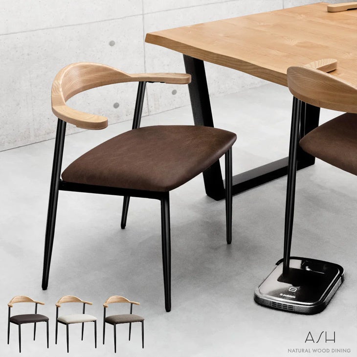 はっきりとした木目が特徴的なアッシュ材の背もたれに、ブラックスチール脚を組み合わせたモダンスタイルのダイニングチェアです。座面はしっとりなめらかな手触りのPU座面と、オールシーズンさらりと快適なファブリック座面の2種類からお選びいただけます。カラーはPU座面の〈オールドブラウン〉〈ブラウニーブラック〉と、ファブリック座面の〈ベージュ〉〈グレージュ〉の4色展開となります。