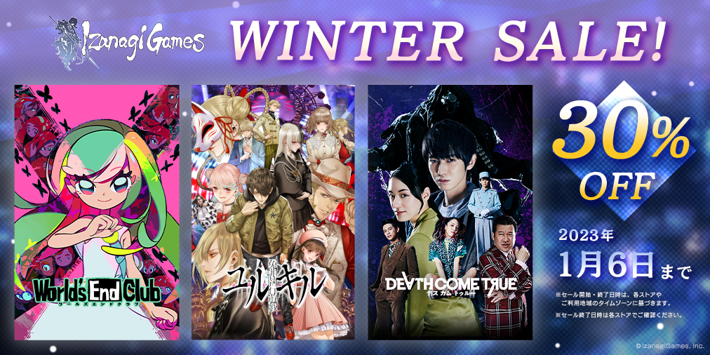 株式会社イザナギゲームズ(東京都江東区、プロデューサー兼CEO:梅田慎介)は、『Death Come True(デスカムトゥルー)』、『ワールズエンドクラブ【World's End Club】』、『冤罪執行遊戯ユルキル』の3作品のウィンターセールの実施を発表いたしました。