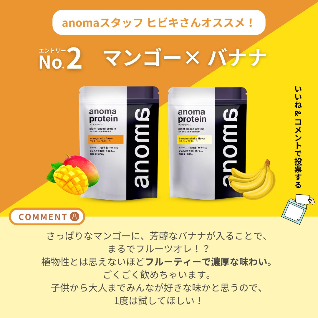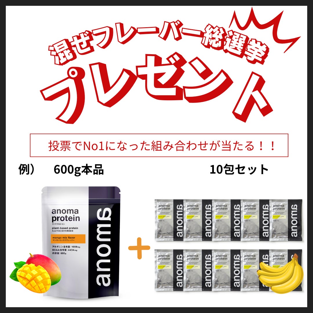 投票期間終了後、最も投票数の多かった混ぜフレーバーに投票された方の中から2名様に、anomaプロテイン600gの本品と味の異なる個別包装10袋をプレゼント!