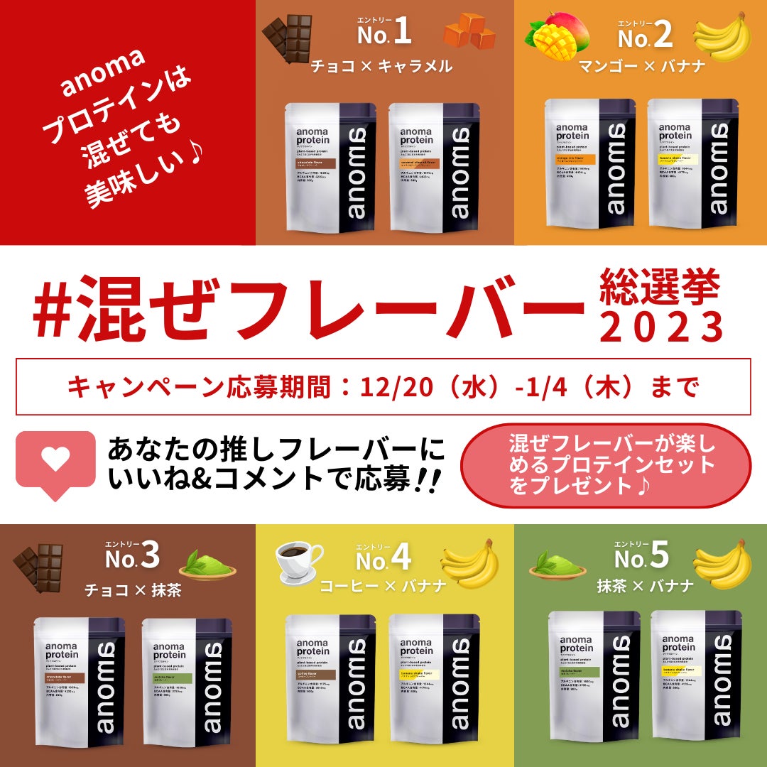 2023年12月20日 累計50万食販売を達成したえんどう豆由来の100%植物性ピープロテインブランドanomaは、「美味しいから続けられる」と、ユーザーより高い評価を頂いています。2023年12月20日(水)よりanomaプロテインの楽しみ方をもっと広げるキャンペーン「#混ぜフレーバー総選挙2023」を開始いたします。本キャンペーンでは、現在展開する8フレーバの中からスタッフのお気に入りブレンド5メニューをInstagramに公開し、新たなanomaの味わいと楽しみ方をお客様にお届けいたします。