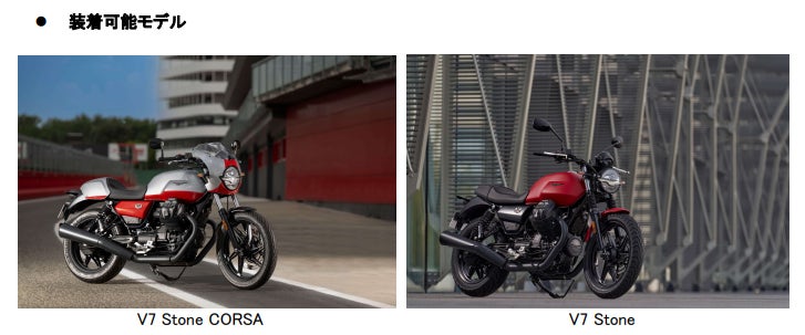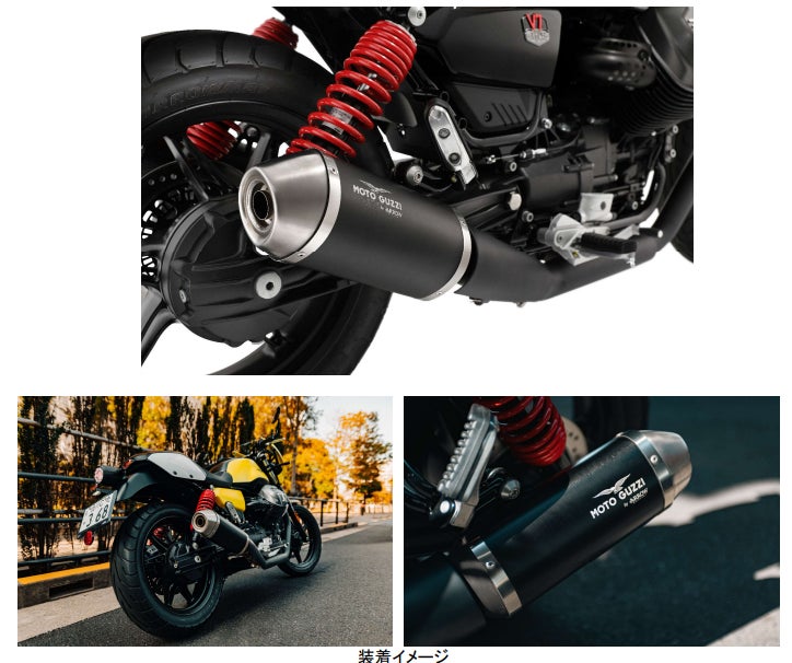 このサイレンサーキットは、公道走行に必要な基準をクリアし、車検対応のエキゾーストシステムです。ブラッ クを基調としたサイレンサー部には MOTO GUZZI のイーグルマークと、製造元である ARROW のロゴを配した 美しい仕上がりを誇ります。先に販売を開始した V7 Stone CORSA にも装着が可能で、さらにスポーティな外 観と走りを演出します。