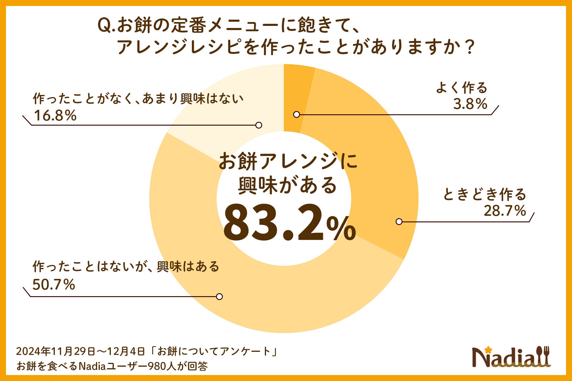 一方、「お正月が過ぎると食べる機会が減り、お餅が余る」「いつも同じ味で飽きる」「新しいレシピが知りたい!」といった声やお悩みも多くあがりました。実際に「お餅の定番メニューに飽きて、アレンジレシピを作ったことがありますか?」という質問では、「よく作る」が3.8%、「ときどき作る」が28.7%に対し、「作ったことはないが、興味はある」が50.7%と半数を超える結果に。